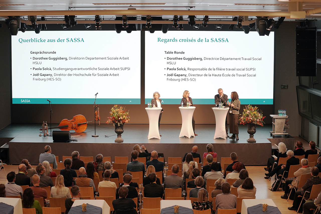 Les potentiels et les défis de la compréhension mutuelle ont été abordés lors de la table ronde animée par Eveline Ammann Dula, BFH Travail social, avec des “regards croisés de la SASSA”. Dorothee Guggisberg, directrice de la HSLU Travail Social, Paola Solcà, responsable de la filière Travail social SUPSI et Joël Gapany, directeur de la HETS Fribourg, tous membres du comité de la SASSA, ont souligné la nécessité de se prononcer sur la politique de formation en adoptant une perspective professionnelle.